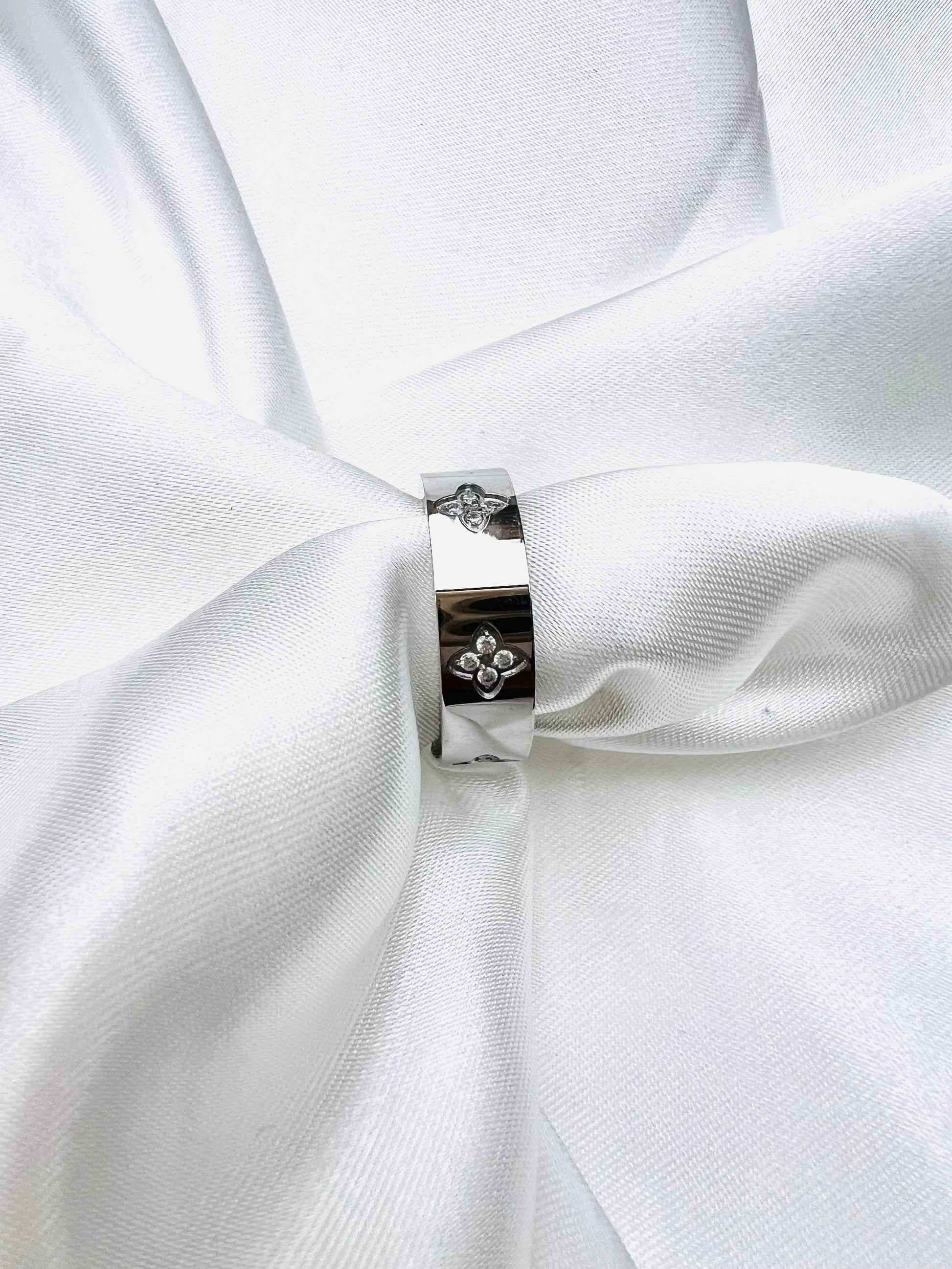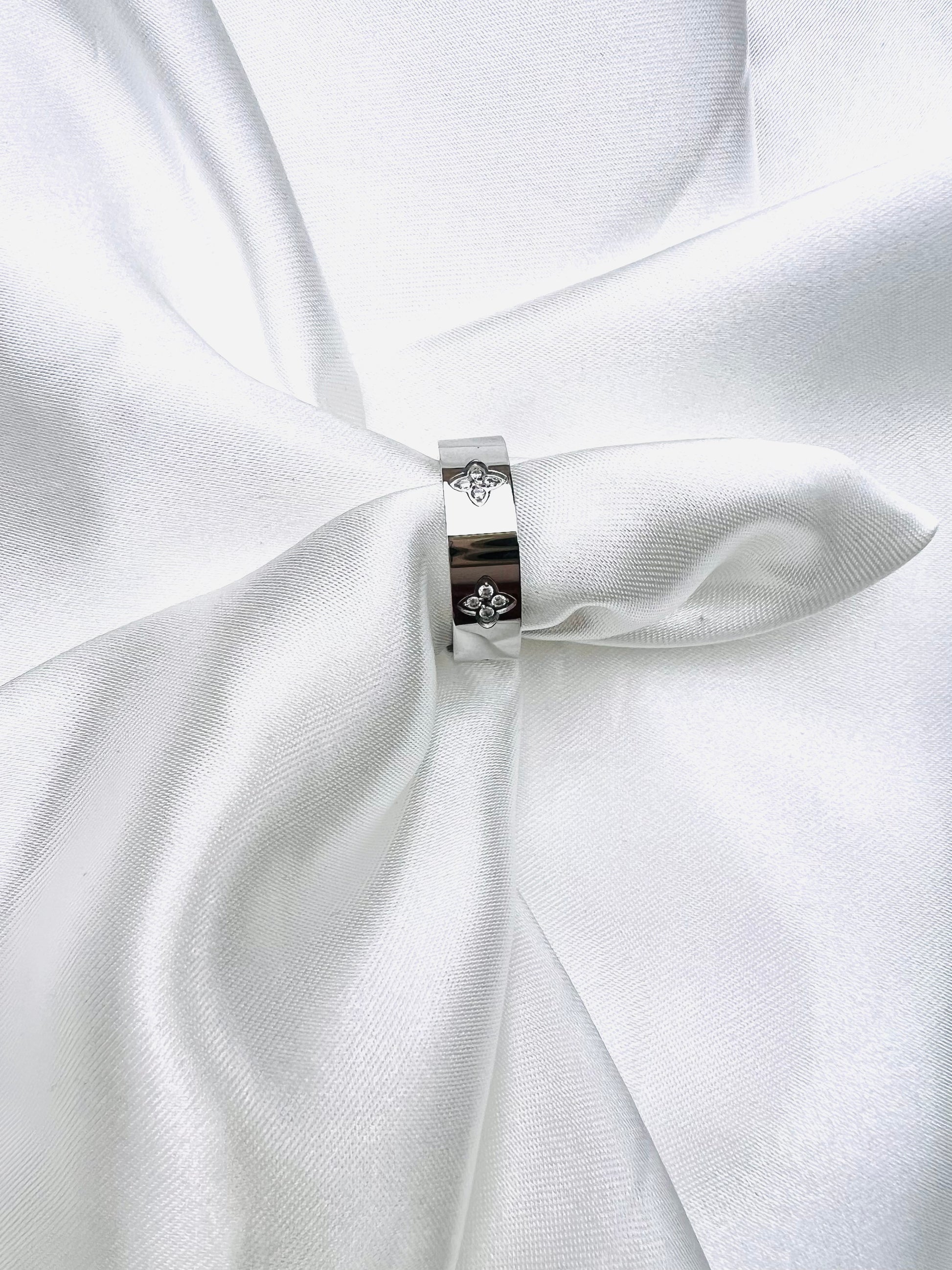 Une bague en format anneau argenté, confectionnée en acier inoxydable plaqué or 18K, alliant éclat et résistance. Tout autour de l’anneau, de délicats cristaux de zircon dessinent de jolis trèfles scintillants, symboles de chance et d’élégance. Raffinée et intemporelle, cette bague se porte aussi bien au quotidien que pour les grandes occasions.