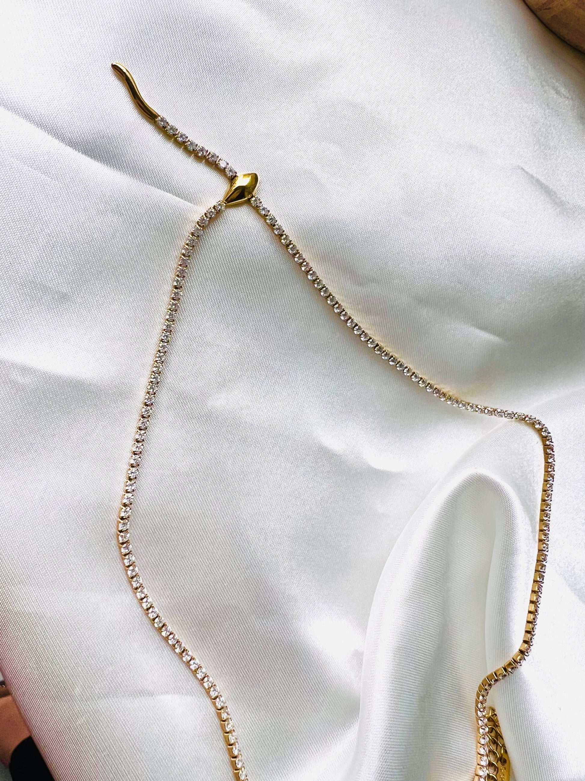 Le collier incarne le luxe et la sophistication. Sertis de cristaux de zircon étincelants qui captent la lumière comme de véritables diamants, il brille avec intensité, de jour comme de nuit.