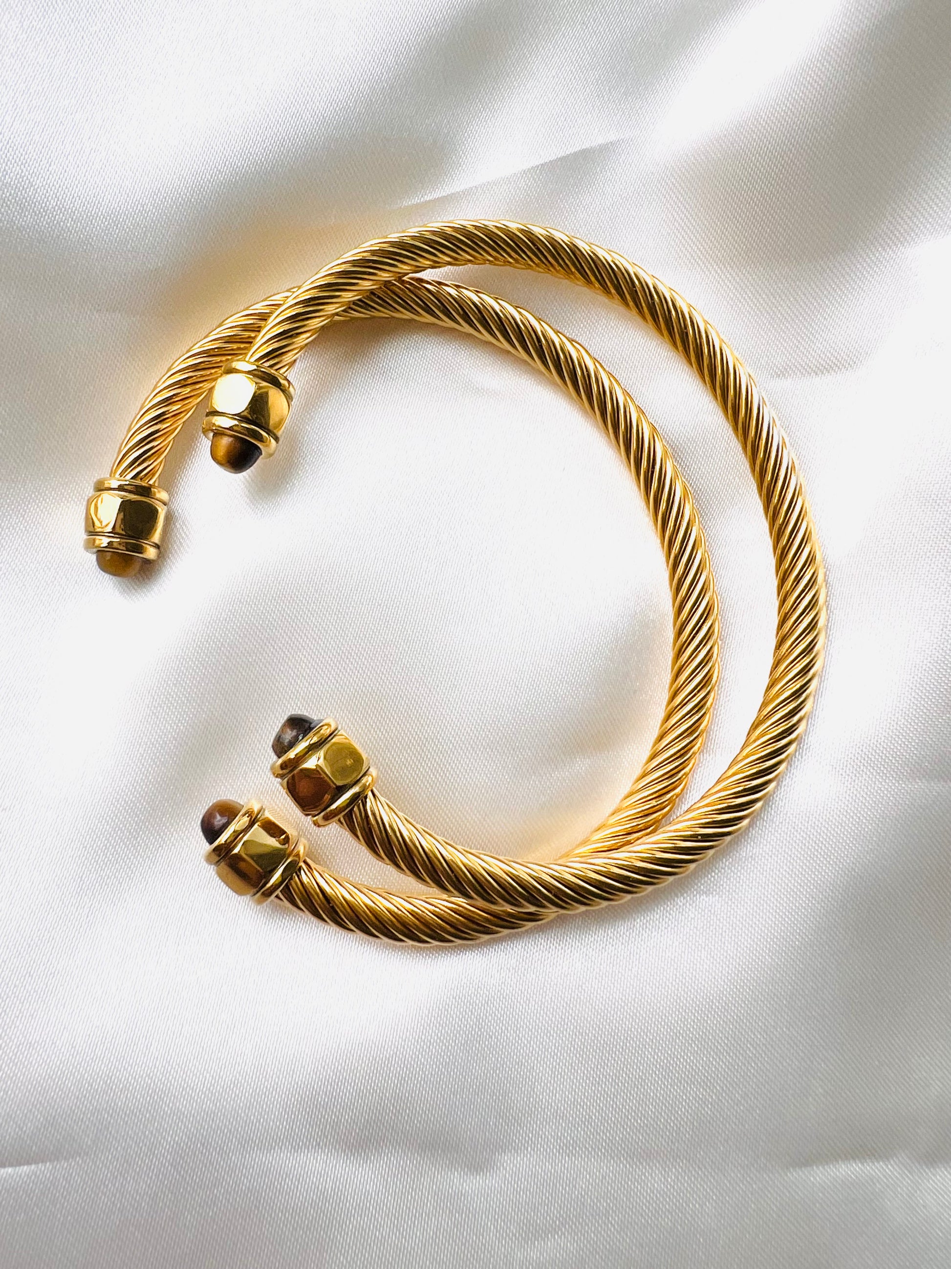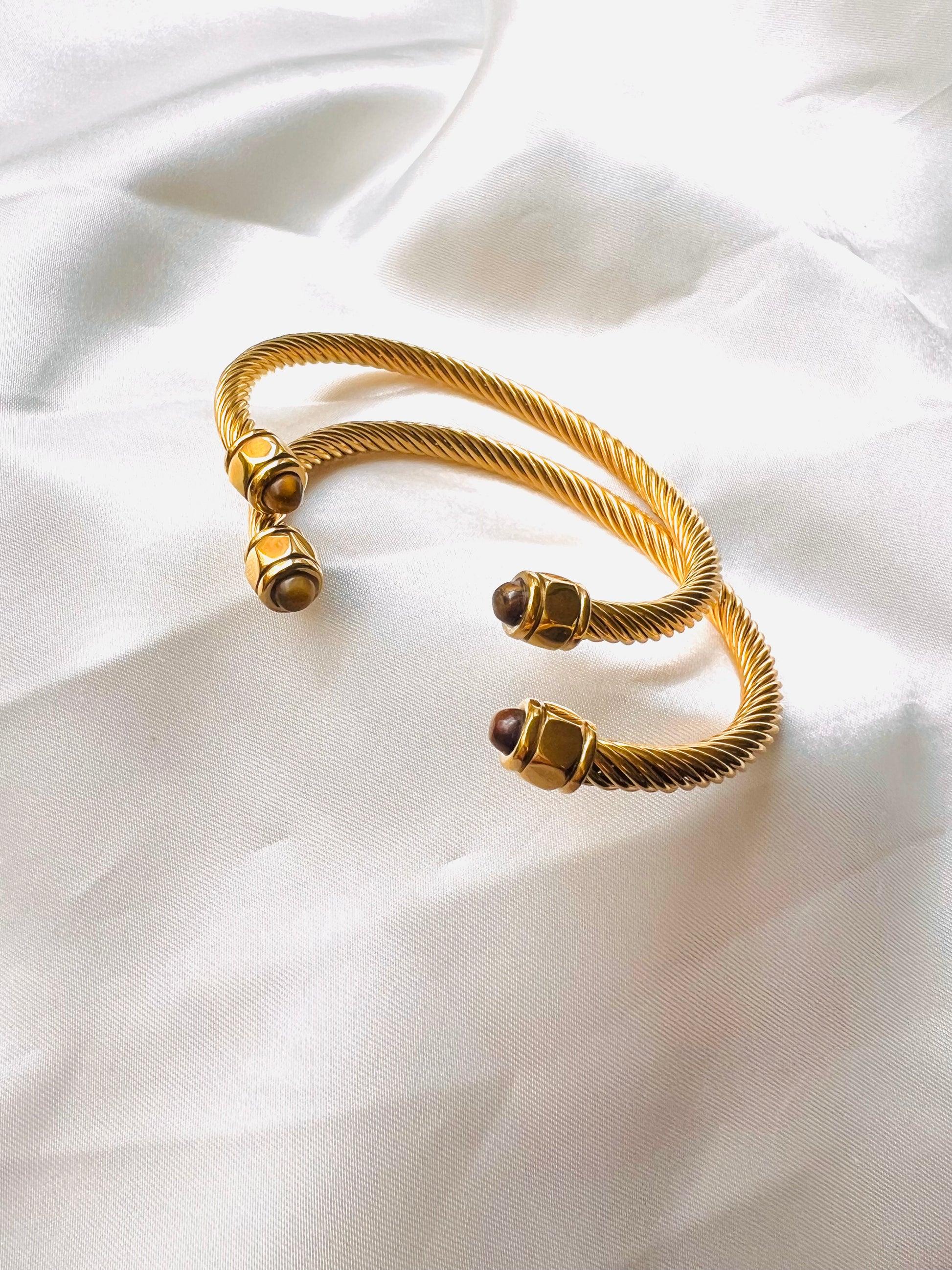Cette manchette se distingue par son design tressé élégant et raffiné, offrant une texture riche et dynamique. Ouverte à l’avant, elle facilite l’ajustement et apporte une touche moderne et légère au poignet. De part et d’autre de l’ouverture, deux pierres naturelles d’Oeil de Tigre viennent sublimer la pièce, apportant chaleur et énergie grâce à leurs reflets chatoyants et leur couleur brun-doré unique.